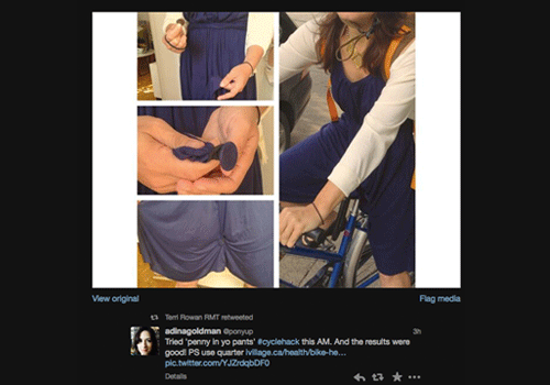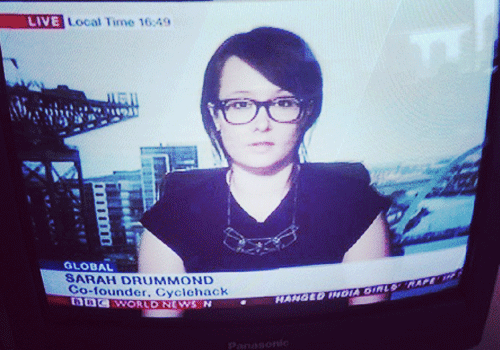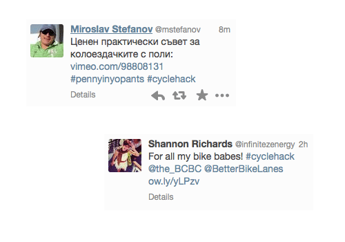Less than a week from the CycleHack we start noticing our knees and skirts making the rounds on twitter under the hashtag #pennyinyopants. Before too long, we’ve seen links in Spanish, Russian, Greek and Bulgarian. We hit 100k hits on our video.